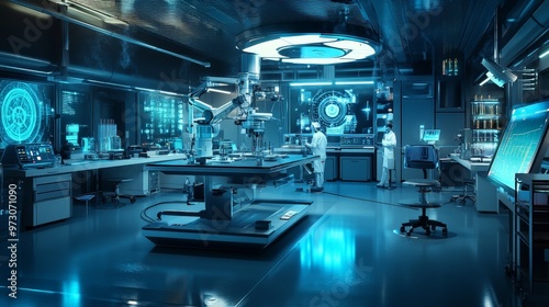 A futuristic laboratory with advanced scientific equipment. Researchers use AI-driven analysis tools