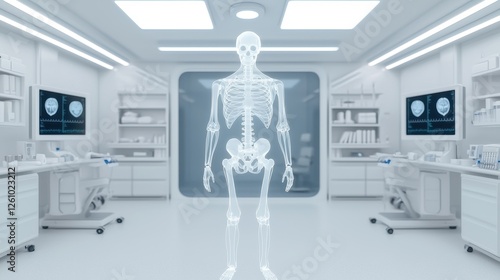 A futuristic medical lab featuring a translucent skeleton model, advanced imaging equipment, and a clean, sterile environment designed for anatomical study.