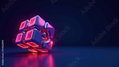 A Futuristic Metallic Cube with Glowing Neon Accents Rotating on a Dark Surface