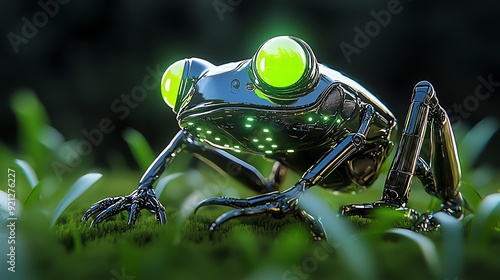 A futuristic, metallic frog with glowing green eyes sits on a bed of grass.