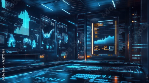 A futuristic office filled with business success icons and a glowing interactive chart representing financial growth