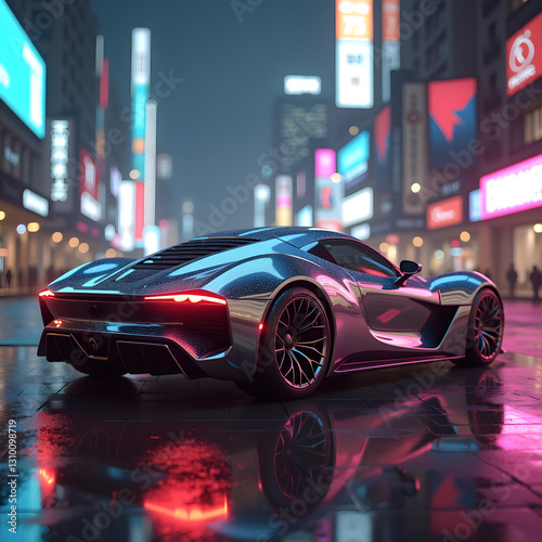 A futuristic sports car shines under neon lights in a bustling city street, reflecting vibrant colors on the wet pavement at night