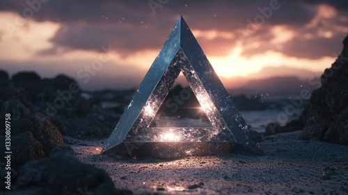abstract, triangle, geometric, shape, architecture, design, futuristic, modern, glowing, light, energy, sparkle, galaxy, cosmos, space, star, surface, terrain, ground, sand, rock, stone, landscape, environment, nature, dusk, sunset, dawn, sky, cloud, aethereal, reflective, crystal, metallic, glasses, steel, dark, texture, detail, view, horizon, depth, contrast, calm, serene, artistic, visual, element