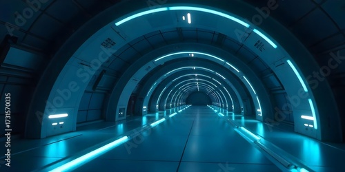 A futuristic tunnel with blue neon lights, the tunnel is dark, and the lights create a sense of depth; the floor is reflective
