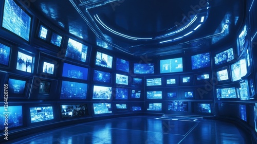 A futuristic wall of television screens displaying diverse content, including videos and images, set against a sleek blue background in 3D.