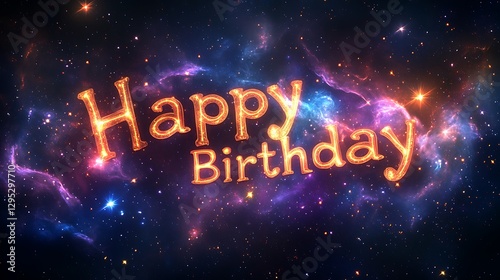 A galaxy-inspired "Happy Birthday" design with bold, glowing letters, radiant constellations and swirling nebulas in vibrant hues of purple, blue, and gold, a serene yet dynamic space background,