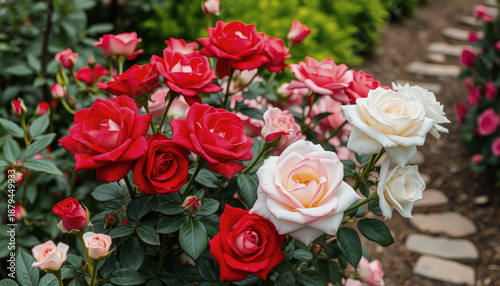 rose, garden, flower, rose, pink, white, red, green, foliage, path, nature, rosebush