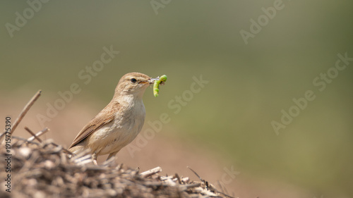 A garden warbler catches a bright green caterpillar, prepearing to feed hungry chicks.
