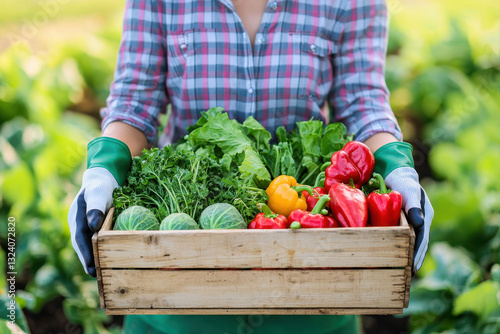 A gardener holds a wooden crate filled with fresh, vibrant vegetables from the harvest.