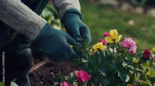 A gardener planting flowers in a residential backyard. Featuring nature and nurturing
