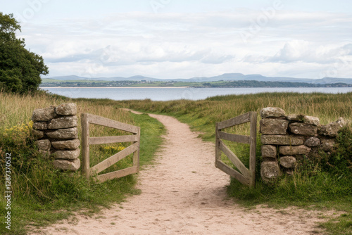 gate, open, grassy, field, next, body, water, landscape, path, nature, wooden, side, stone, wall, right, left, summer, sky, blue, grass, scenic, rural, beautiful, green, travel, view, countryside, sea, plant, outdoors, fence, beach, background, wood, coastline, meadow, country, hiking, ocean, park, coast, hill, farm, tour tourism, scenery, way, horizon, pathway, footpath