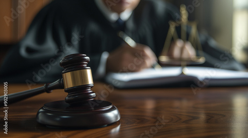 A gavel on a desk in a courtroom with blurred figures in the background.