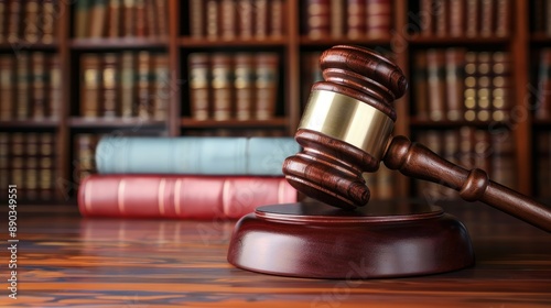 A gavel on a table with a bookcase in the background, indicates legal environment, judicial equipment, courtroom tools