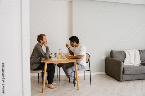 gay, couple, black, white, 30s, man, dinner, cereal, eating, chatting, apartment, minimalistic, adult, people, indoor, inside, boyfriend, happy, wholesome, cute, couch, juice, meal, breakfast, togetherness