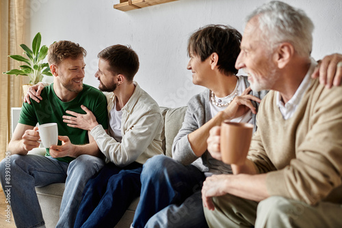 A gay couple sits with parents on a couch, enjoying conversation and coffee.