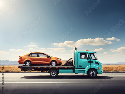 A generic unidentifiable car carried on a towing or recovery breakdown truck moving on the highway for repair or warranty services is imagined as a big banner design with copy space design.