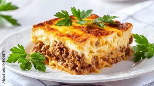 casserole, comfort food, ground meat, pasta, epicure, traditional, cookery, homemade, dish, food, meal, lunch, dinner, savoury, delicious, flavorful, parsley, white plate, table setting, closeup, macro, detailed, texture, golden brown, baked, layered, meat sauce, rustic, gathering, side dish, portion, elegant, presentation, food photography, culinary, closeup