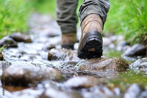 A gentle figure is seen walking across a calm stream in a lush forest, highlighting natural beauty, quietude, and the allure of outdoor excursions