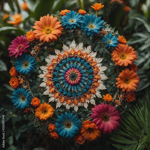 A geometric floral mandala design using tropical flowers, side-view, in crisp DSLR detail with a soft-focus background.