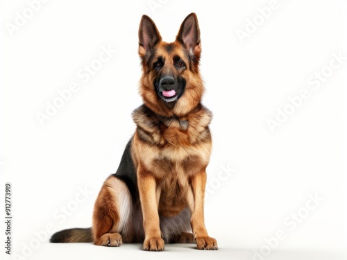 A German Shepherd looks attentively. Its tongue is sticking out, and its fur is black and brown. Its ears are raised, demonstrating an intelligent expression on its muzzle. AI generated.