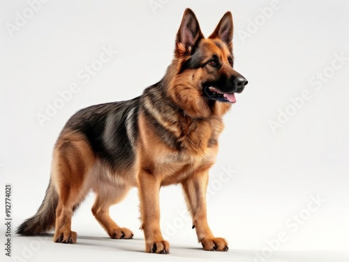 A German Shepherd looks attentively. Its tongue is sticking out, and its fur is black and brown. Its ears are raised, demonstrating an intelligent expression on its muzzle. AI generated.