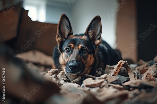 dog, german, shepherd, debris, collapsed, building, debris, indoor, construction, rescue, abandoned, calm, day, alert, pet, animal, destruction, architecture, nature, survivor, loyalty, terrain, emotion, eye, relaxed, background, light, shadow, structure, environment, safety, landscape, loyal, companion, canino, adoption, residential, exploration, danger, city, ruin, disaster, companionship, sharpened, wreckage, furry, friends, home, urban