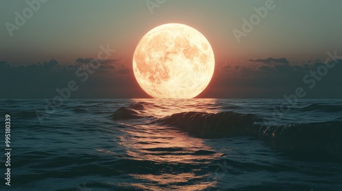 A giant, glowing moon rising over a calm ocean, casting its light on the waves