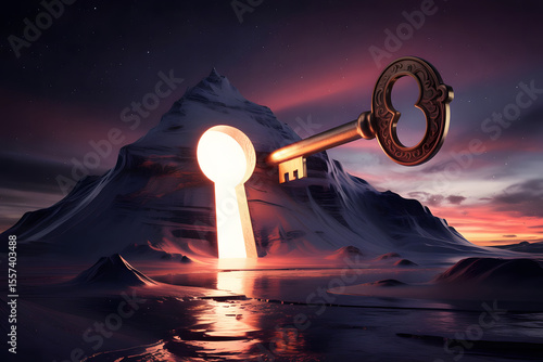 key, giant, mountain, unlocking, glowing, vale, discovery, potential, surreal, metaphor, nature, dramatic, symbolic, hidden, light, structure, landscape, portal, mystery, power, elevation, energy, cavern, terrain, illusion, form, conceptual, doorway, imagination, breakthrough, fantasy, access, vision, scenery, wonder, entrance, spark, surrealism, twirling, shape, climb, surrealist, glow, immensity, metaphoric, unlock