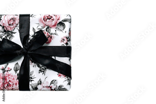 gift, box, wrapped, floral, pattern, paper, ribbon, black, satin, bow, tied, present, festive, pretty, elegant, delicate, romantic, flower, rose, peony, design, decor, wrapping, presenting, celebration, celebratory, occasion, special, decoration, vintage, classic, beauty, sophistication, luxury, artistic, impression, gift wrap, top, view