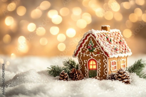 gingerbread, house, snow, pine, branch, window, warm, glow, christmas, holiday, festive, sweet, treat, december, winter, cosy, cute, delicious, decorated, frosting, candy, sprinkle, sugar, icing, light, bokeh, background, white, brown, green, red, yellow, season, tradition, celebration, family, joy, magical, whimsical