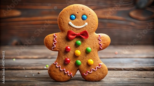 A Gingerbread Man with Blue Eyes and a Red Bowtie Smiles on a Rustic Wooden Surface