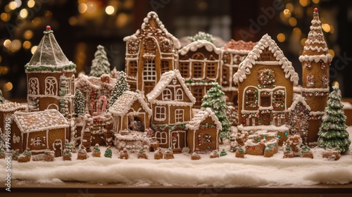 christmas, winter, gingerbread, village, house, snow, candy, decoration, roof, frosting, sugar, icing, sprinkle, light, tree, green, red, white, brown, baked, festive, holiday, celebration, tradition, sweet, delicious, tasty, treat, dessert, confection, pastry, edible, architecture, miniature, model, scene, display, background, blurred, sharpened, bokeh, depth, closeup, detail, texture, craft, art, creative