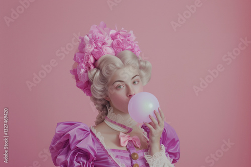 A girl blows bubble gum, dressed in exquisite baroque costumes, showcasing elegance and historic charm, with a pink background.