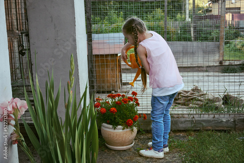 A girl child watering flowers from a yellow watering can, next to it is a valier for a dog. Care of plants and garden and vegetable garden. Girl with long pigtails