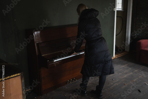 A girl in a black coat plays an old piano in an abandoned house.