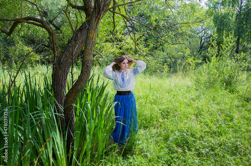 A girl in a long blue skirt and an embroidered shirt among the green meadow and marsh grass and willow trees.