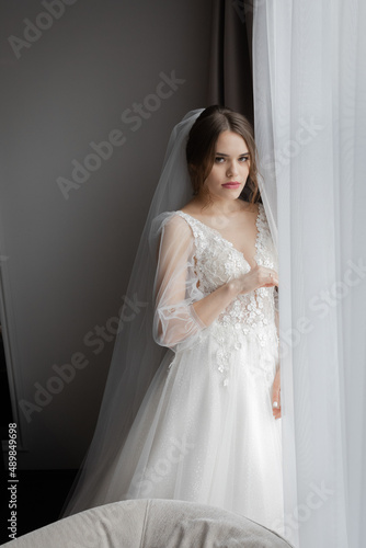 A girl in a wedding dress, a bride with flowers, delicate details.