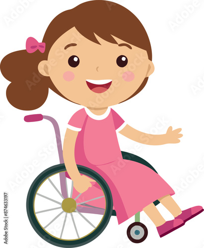 A girl in a wheelchair is smiling and waving