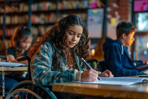 wheelchair, student, classroom, writing, girl, education, studying, learning, disabled, school, focused, desk, children, bookshelf, diversity, inclusive, homework, young, children, background, friends, scholar, note, concentration, book, disability, teamwork, academic, inclusion, thoughtful, literature, lesson, library, happiness, community, youth, determined, effort