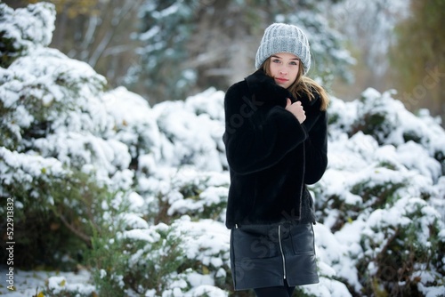 A girl in fashionable winter clothes stands against the background of a winter landscape with snow.