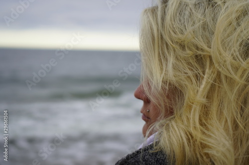 A girl looks into the distance against the backdrop of a cold sea. Blond hair in the wind. Hair and sea breeze. close-up.