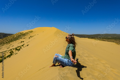 A girl on the sand dunes of Sarykum. The desert in Dagestan. Russia. 2021.