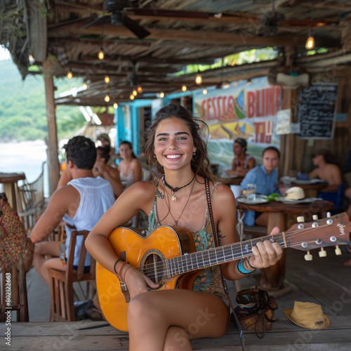 girl, playing, guitar, cafes, music, woman, eatery, smile, people, fashion, store, urban, bar, smiling, face, person, beauty