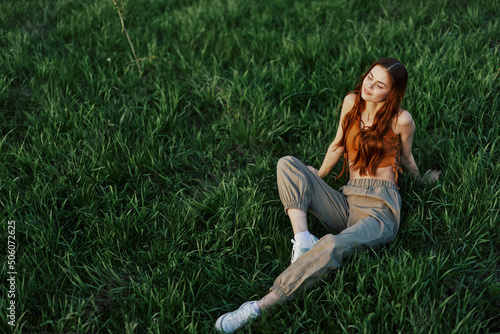 A girl sits on the grass in the park and enjoys the beautiful view of the summer sunset