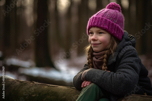 A girl sitting on a log in a forest and smiling