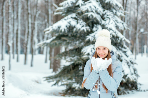 A Girl Wearing Warm Winter Clothes And Hat Blowing Snow In Winter Forest, horizontal. Model with a beautiful smile near the Christmas tree.