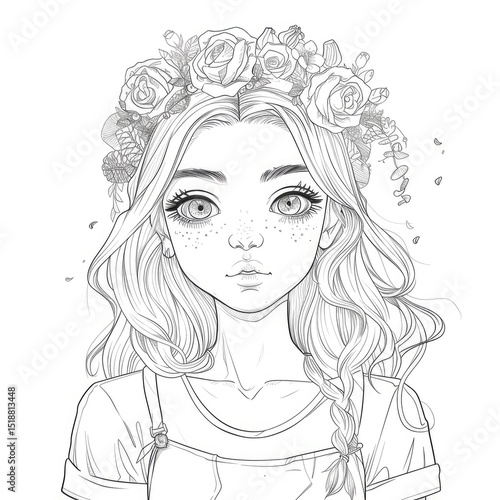 ornamental, rose, cute, black, flower, page, beauty, girl, art, line, elegant, monochrome, crown, white, long hair, portrait, decorative, young, coiffure, printable, aesthetic, vignetting, whimsical, eye, drawing, doodle, design, woman, fashion, illustration, style, floral, pretty, hair, detail, graphic, face, colouring
