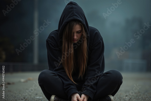 girl, sitting, dark, hoodie, long, hair, ground, black, looking, down, sombre, mood, sad, alone, night, urban, street, quiet, contemplative, young, female, lonely, pensive, solitude, hood, shadow, melancholy, introspective, isolated, reflective, subdued, thoughtful, stillness, photo, realistic, real, background
