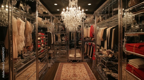 A glamorous walk-in closet with mirrored walls, chandeliers, and organized shelves.
