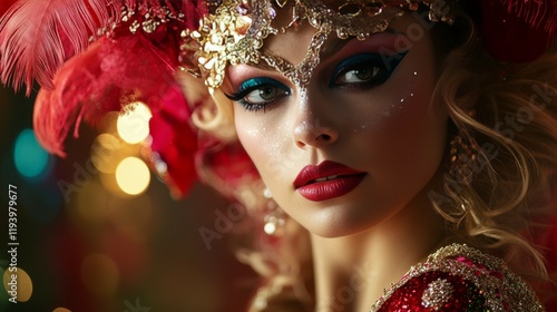 carnival, portrait, elegance, red, gold, headdress, feather, make-up, bold, glamourous, beauty, ornate, radiant, glistering, vibrant, bokeh, culture, festive, celebration, dramatic, fashion, artistic, striking, statement, luxurious, regal, sophistication, jewellery, shimmering, feminine, cultural, pride, charme, dazzling, allure, intricate, heritage, glowing, creative, confidence